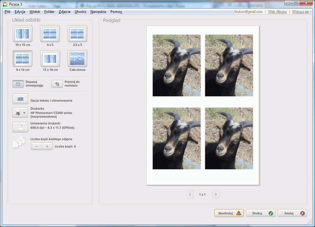 Tak obrobioną fotkę teoretycznie można już wydrukować na drukarce. Niestety, otrzymamy w ten sposób jednak tylko jedną odbitkę, a poza tym nie zawsze ze sterownikiem drukarki da się "dojść do ładu" pod kątem właściwego ustalenia rozmiarów fotki na wydruku. Nawet jeśli proporcje mamy dobre, to sterownik nie zawsze je zachowa, a do tego zapewne rozszerzy naszą fotkę na cały rozmiar odbitki. Dlatego najczęściej natychmiastowy wydruk nie jest tu dobrym postępowaniem. Jako przykład problemów zamieszczam poniżej zrzut ekranu z próby ustawienia parametrów wydruku dla oprogramowania do mojej drukarki HP,. Nie udało mi się poprawnie ustawić parametrów wydruku kilku zdjęć obok siebie w odpowiednim rozmiarze. Teoretycznie ten sterownik umożliwia umieszczenie obok siebie 4 fotek. Jednak są one rozciągnięte na cały obszar wydruku co nie daje właściwego rozmiaru zdjęcia legitymacyjnego. To się do naszego celu, niestety, nie nadaje. Jak widać użytkownik nie ma tu pełnego wypływu na parametry wydruku. Ja nie umiałem dojść do ładu z moim sterownikiem drukarki w celu uzyskania właściwego efektu. Musiałem poradzić sobie inaczej.