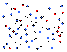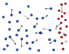 Oczywiste jest, że jeśli cząsteczki tych gazów chaotycznie poruszają się, zderzają, przekazują energię kinetyczną, to wkrótce nastąpi ich wymieszanie i powstanie sytuacja np. jak na rysunku poniżej.